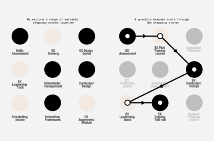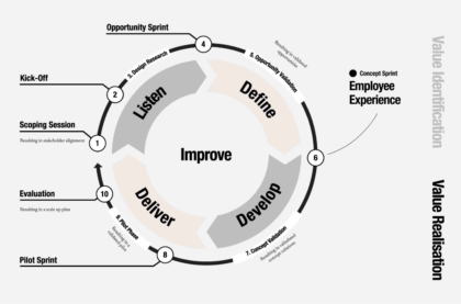 Sounds good? Our services can help address your strategic HR challenges. Our EX Design Sprint proposition allows us to tackle one of your specific EX-related issues. For a broader assessment, our DT EX Assessment puts the thermometer into your organization, evaluating your EX from both an HR and overall organizational perspective. If your team needs to build foundational EX design skills, our DT EX Training can equip them with the necessary knowledge and mindset. Finally, for a comprehensive EX overhaul, our Full EX Design project guides you through the entire process, working closely with your organization.
